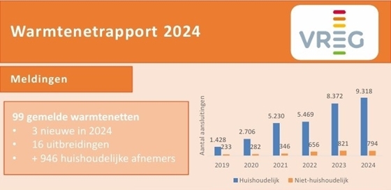 Sinds 2019 organiseert de Vlaamse Nutsregulator (het vroegere VREG) een jaarlijkse bevraging onder alle leveranciers en netbeheerders van warmte- of koudenetten in Vlaanderen. De resultaten van deze bevraging publiceert de VNR in een jaarlijks Warmtenetrapport. Het meest recente rapport, gepubliceerd eind oktober 2025, schetst de warmtenetmarkt in 2024. In 2024 tekende de sector opnieuw een mooie groei op met 3 nieuwe netten en 16 bestaande netten die werden uitgebreid.