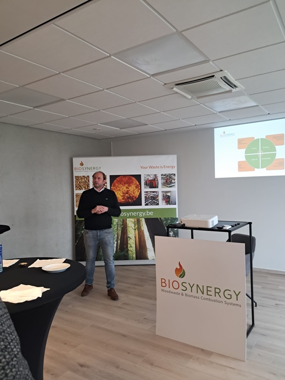 Daarna reed de bus verder richting Ronse waar de deelnemers het project van Thibaut De Veyt van Biosynergy konden bezoeken. Op dit bedrijventerrein werken lokale spelers nauw samen: de houtverwerkende bedrijven leveren hun biomassa-afval aan biosynergy, die hen (en anderen) bevoorraadt van duurzame warmte voor de verwarming van hun kantoren en proceswarmte. Afsluiten deden we op het landbouwbedrijf van Joachim De Ruyck. Hij investeerde in een vergisteren van Biolectric en focust in zijn bedrijf op circulariteit en autonomie.